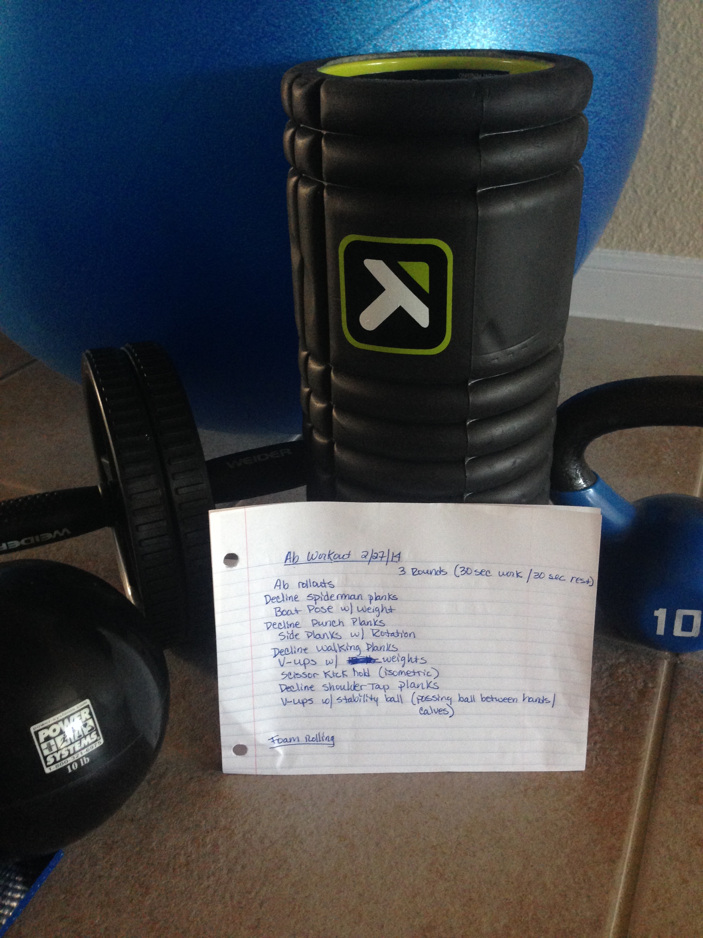My life has been pretty hectic lately, so I have been designing efficient and effective home workout routines. After several hours studying yesterday for my personal trainer certification, I needed a good core workout to work out those kinks in my back and strengthen my abdominal muscles. I utilized some basic equipment I keep on hand for home workouts.